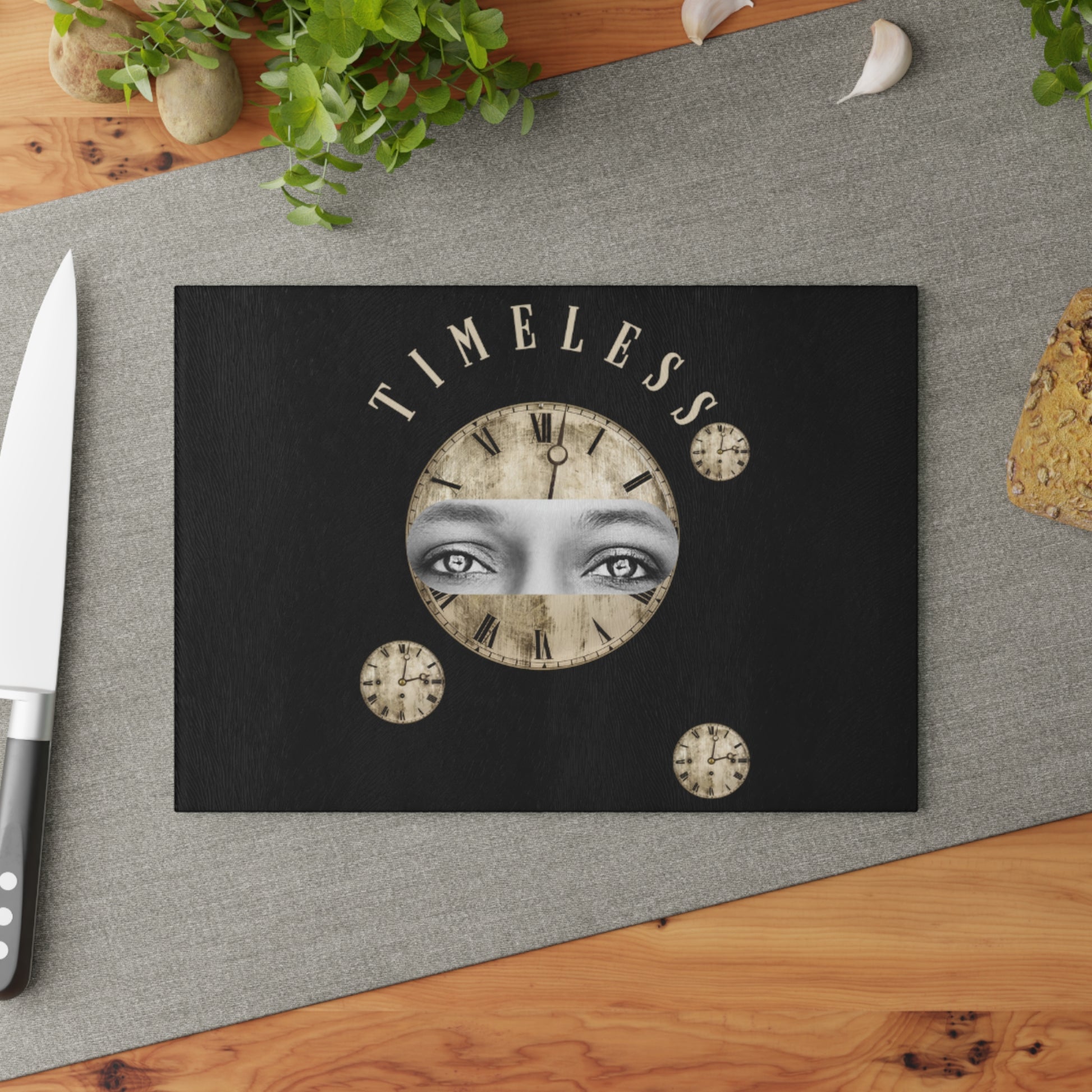 Enhance your chef character with our custom designed glass cutting board! This robust tampered glass material has a textured surface and helps slice, chop and dice your favorite family meals!! Available in two sizes for your preference: 8" x 11" and 11" x 15".
