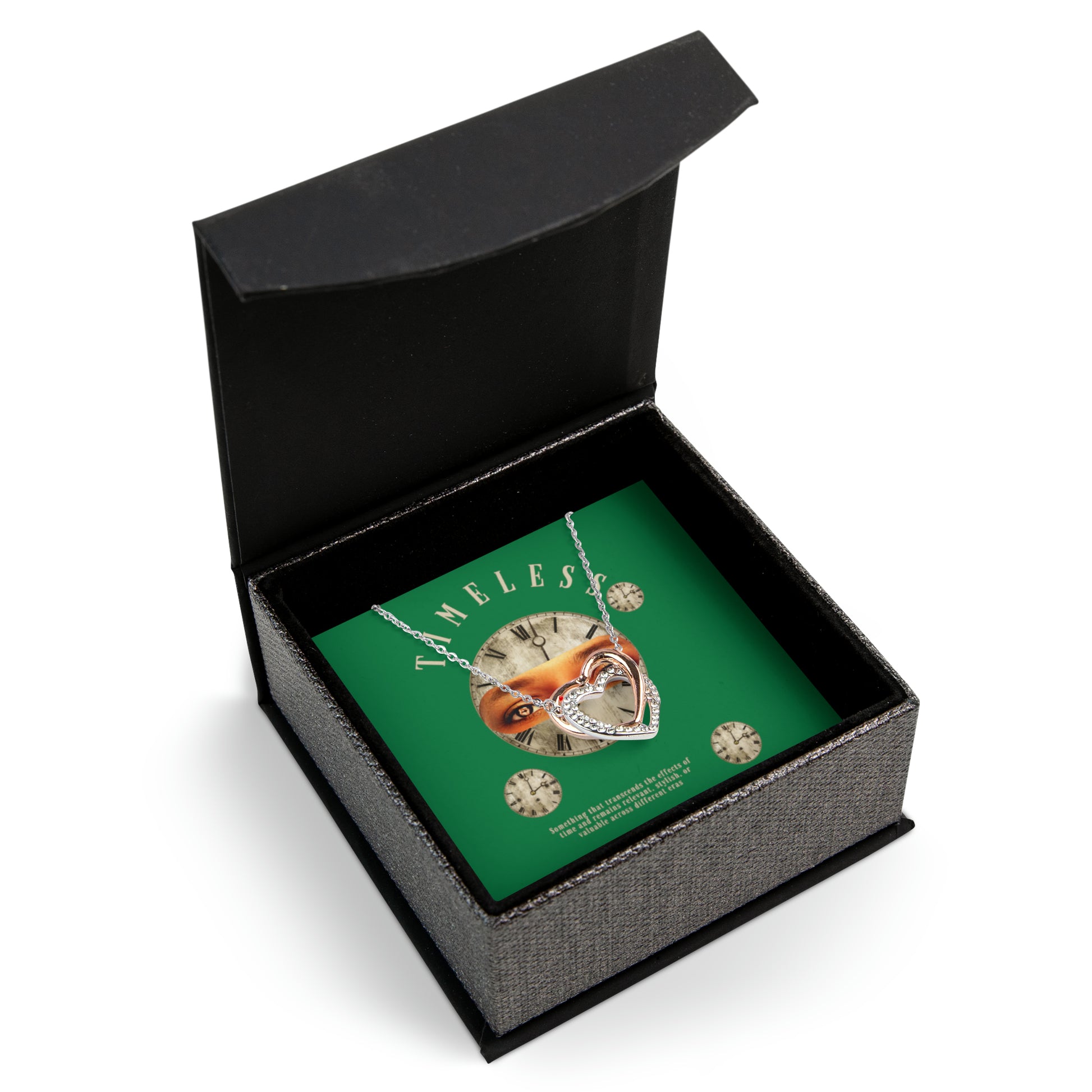 Lift your love and her light with this 18K rose gold-plated brass pendant! Each heart necklace is tarnish-resistant and comes with an elegant twin flames design, as well as an adjustable stainless steel chain with a lobster clasp attachment. Available in 3 elegant box options for your gifting preferences: LED, Textured Magnetic, or Brown PU Leather boxes.
